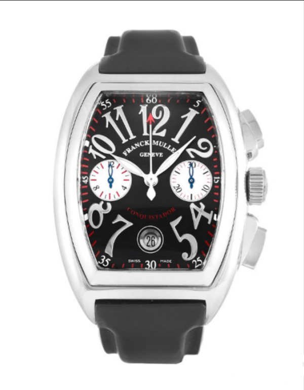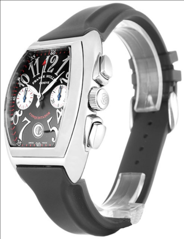 The Franck Muller Conquistador 8005 CC Men Automatic 36 MM watch features a 36mm stainless steel tonneau case. a black dial with chronograph sub – dials. and a black rubber strap. With scratch – resistant sapphire crystal and 30m water resistance. it blends sporty style and functionality for men.