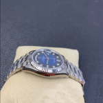 - Dial: A gradient blue sunburst dial adorned with baguette and round diamond hour markers. Features a day-of-the-week display at 12 o’clock and a date window with Cyclops magnification at 3 o’clock.