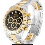 Two-tone Rolex Daytona (40mm) – black dial. gold sub-dials. two-tone Oyster bracelet. Merges chronograph precision (tachymeter. luminous hands) with steel-gold luxury. Durable. versatile (sport/formal). iconic for collectors. Timeless sport-luxury. embodying Rolex’s legacy of precision and elegance in a striking two-tone design. Perfect for those seeking performance-meets-opulence in a classic. eye-catching timepiece.