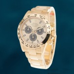 The Rolex Daytona Gold Green Dial Chronograph Watch by C Factory exudes luxury. With a gold case. a unique green dial. and carefully upgraded components. it offers an authentic aesthetic and functionality. Ideal for sophisticated watch connoisseurs seeking a blend of style and precision.