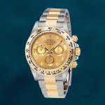 This Rolex Daytona showcases a 40mm two – tone case with a stunning gold dial set with diamond markers. The two – tone Oyster bracelet and gold tachymetric bezel enhance its luxurious sporty appeal. With precise chronograph functions and luminous hands. it marries high – end elegance with practical performance. A timeless piece that embodies Rolex’s heritage of craftsmanship and luxury. perfect for those who desire a blend of opulence and functionality.