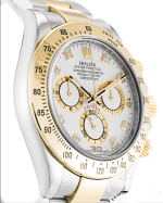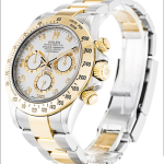 This Rolex Cosmograph Daytona features a two – tone steel and gold case and bracelet. paired with a white dial and gold sub – dials. The Oyster bracelet offers comfort and security. while the tachymetric bezel and chronograph functions provide practicality. With its precise craftsmanship and classic design. this watch is a timeless piece that combines luxury. sportiness. and functionality. appealing to both collectors and those seeking an elegant timepiece.